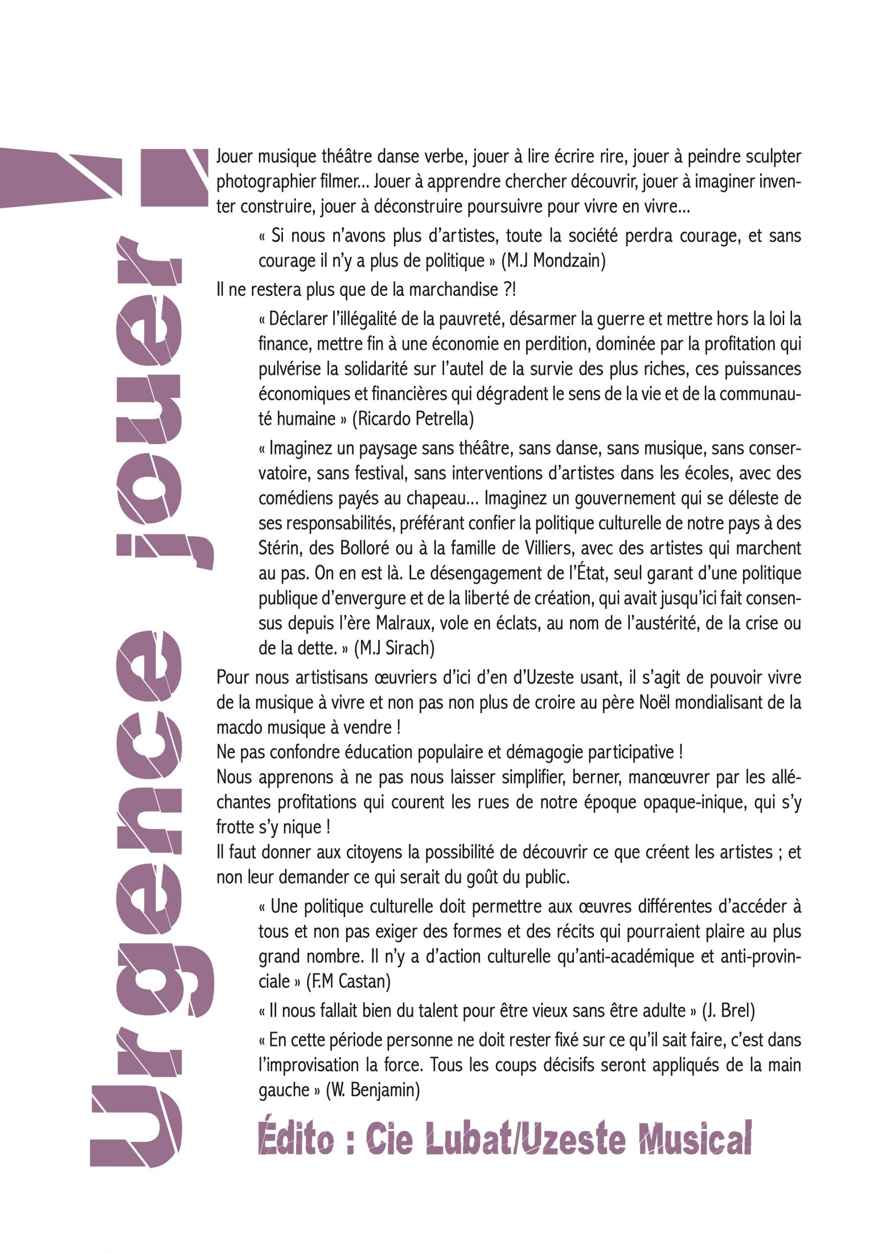 Uzestival hivernal 2026 2026-02-17T13:18:01+01:0017 février 2026| FacebookXTelegramEmail Articles similaires Uzestival hivernal 2025 ! 15 décembre 2025 48ème hestejada de las arts 13 juin 2025 Uzestival de printemps 2025 28 mars 2025 Adhésions 2025 21 mars 2025 Hestejada hivernale 12 décembre 2024 Uzestival Octobre 2024 21 octobre 2024 47ème Hestejada de las arts 26 juillet 2024 Nouvel album 17 juillet 2024 Corneloup/Lubat, mai 2024 23 mai 2024 Uzestival de printemps 2024 20 avril 2024 Photos Hestejada 2023 (Le Ray) 20 février 2024 Photos Hestejada 2023 (Quesemand) 4 septembre 2023 Des oeuvriers dans une mine d’art à ciel ouvert (Olivier Azam) 4 septembre 2023 Serge Pey – Non-festival 2020 4 août 2023 Villages visages 28 juillet 2023 Lubat/Portal/Lubat trio 17 juillet 2023 46ème Hestejada de las arts 10 juillet 2023 Uzestival de printemps 2023 – photos 12 mai 2023 Labeluz – Bandcamp 21 mars 2023 Uzestival de printemps 2023 21 mars 2023 Etat d’engeance – 11/22 – extrait 15 décembre 2022 Communiqué 12 août 2022 Radio Uz 28 juillet 2022 Programmation 45ème Hestajada 23 juillet 2022